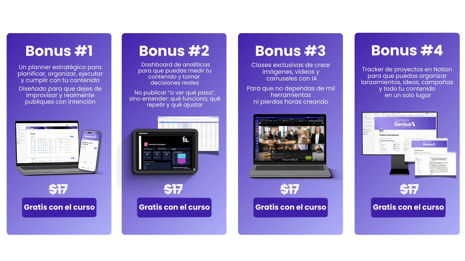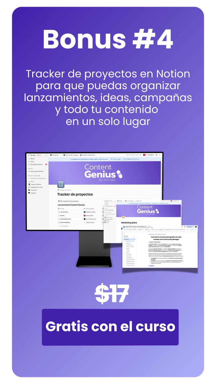 Y esto no acaba aquí, cuando te unes a Content Genius vas a tener acceso a estos bonus exclusivos de regalo para que crear contenido sea aún más simple de hacer