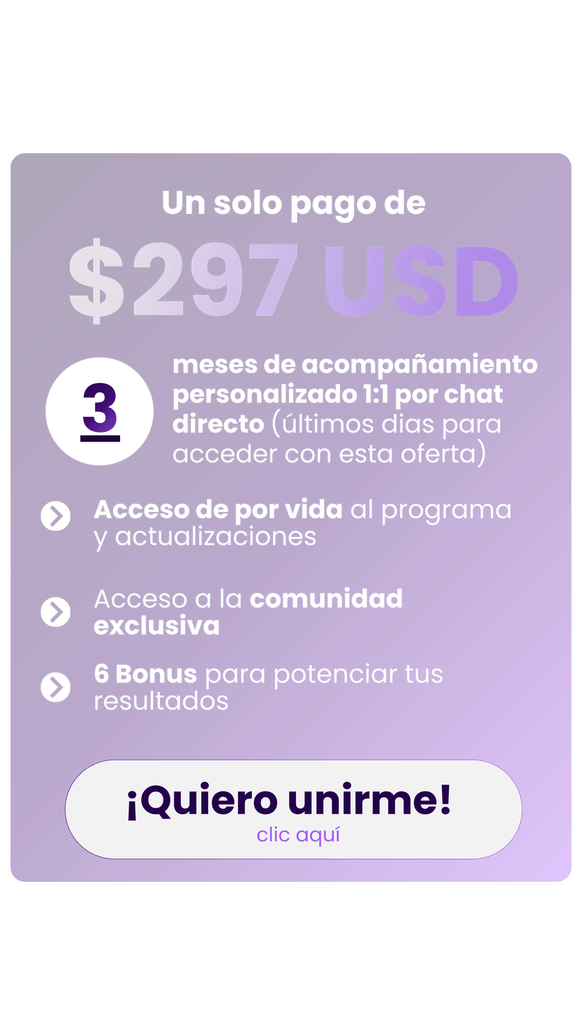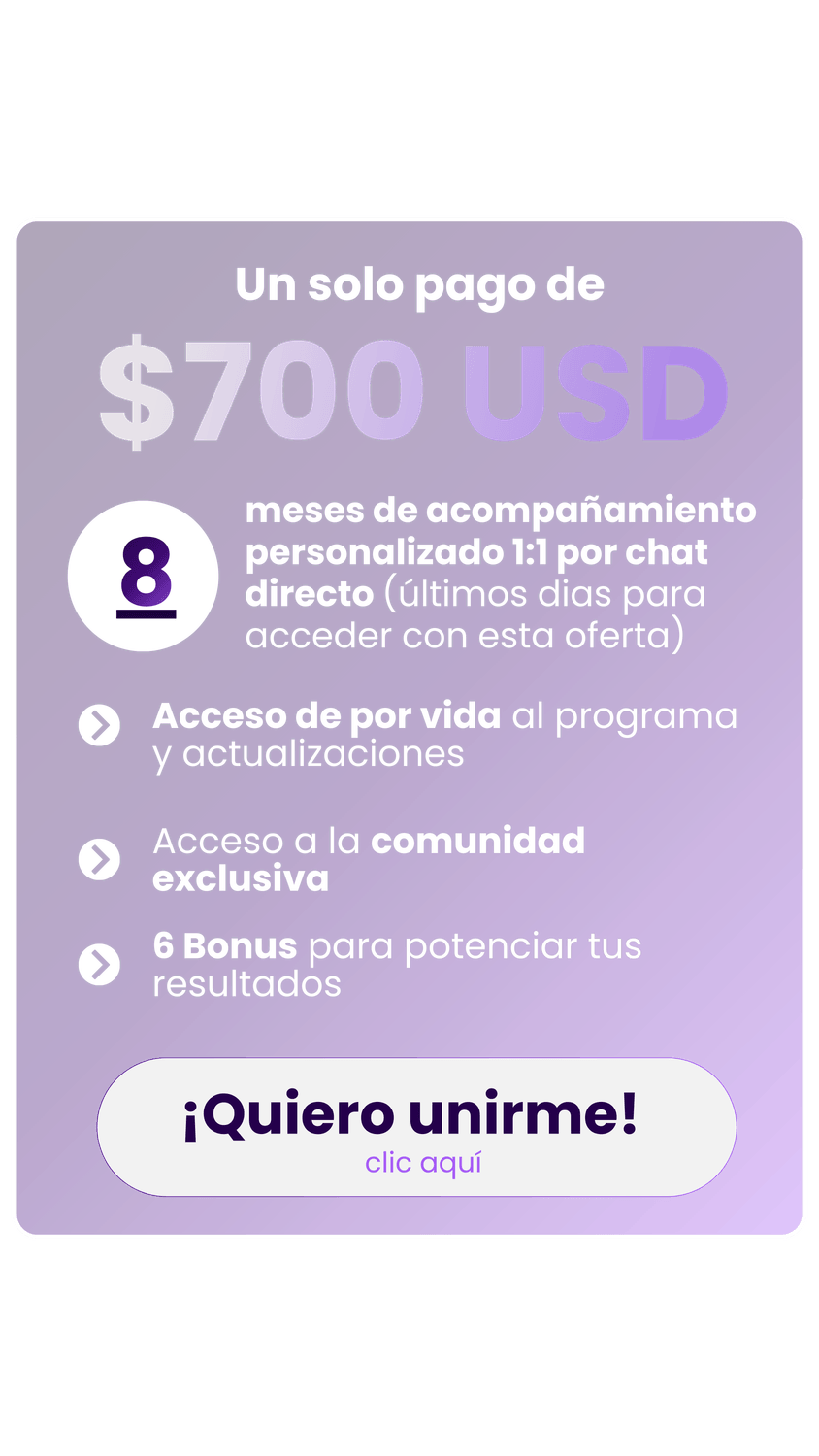 Con esta ruta exacta que te ofrezco podrás ajustar varios detalles que quizás estén afectando el proceso y no estés logrando resultados, además con mi apoyo y el de todo mi equipo te vamos a ayudar a identificar rápidamente las fallas que puedas estar teniendo y darte las mejores recomendaciones para que apliques y así empezar a buscar resultados!